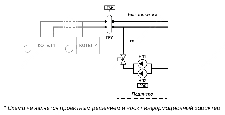 • контроль давления теплоносителя в общем трубопроводе по верхнему и нижнему уровню;